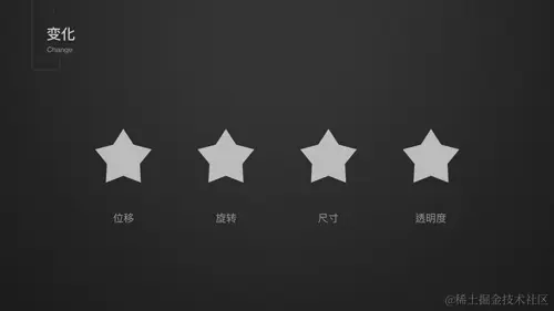 变化可以划分为四类(如动图所示),这四类变化基本涵盖了界面元素的全部运动方式,只要我们准确地描述元素在动效前后的变化量,就可以准确地完成「变化」这个参数的对接。
