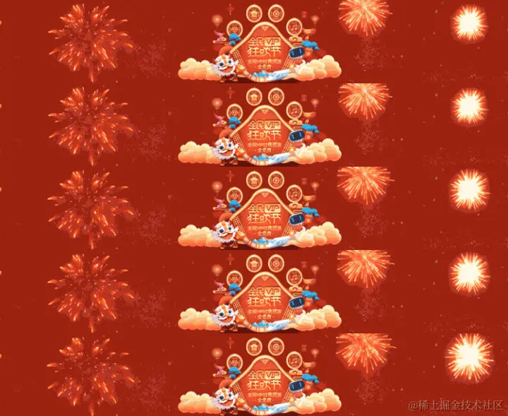 序列帧可以理解为跑马灯、具体实现方式是提供一张动画的帧序列拼图、通过 CSS 和 JS 控制它逐帧播放。跟交互动效不太一样、序列帧动画一般用在运营页面的动画里。举个例子、之前的春节活动里、我曾经做过一个序列帧动画。如下动图所示:
