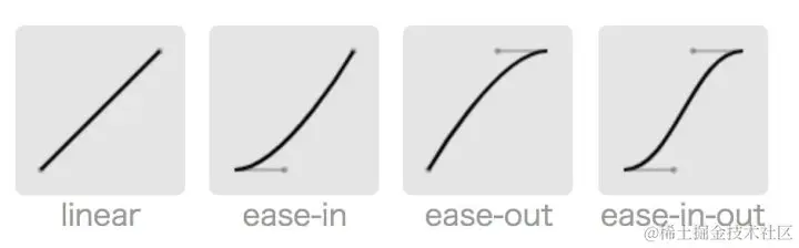 - 圆三: 缓入缓出 ease-in-out:开头结尾都没有速度,先加速、再减速。是我们日常生活中最常见的物理运动。适合用在一个元素从页面 A 点到 B 点。
