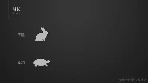 第二个关键参数就是时长,这个顾名思义也就是动画播放的时间长度。无论变化是多是少,简单还是复杂,我们需要把每一段变化的时间确定,时间短干脆利落,时间长轻缓柔和。