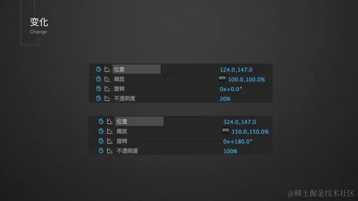 它在 AE 中前后变化的参数如下: