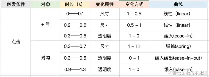 标注的时候除了说明动效的三元素、还要说明触发条件以及动画对象、所以最好用表格的方式、这样可以更清晰的把它们每一段变化都清晰罗列出来: