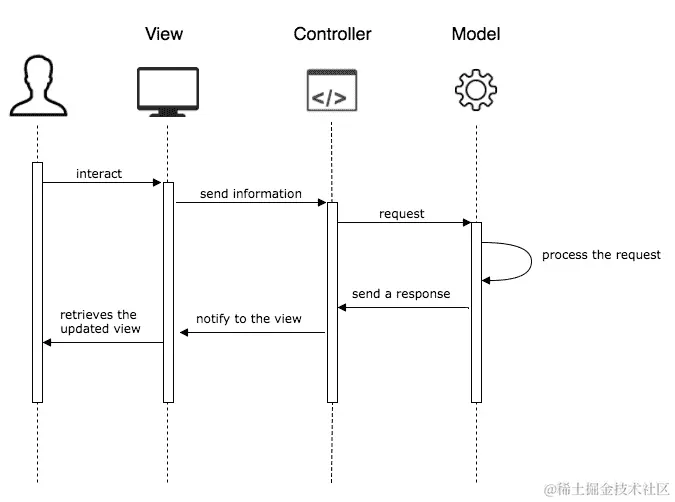 牢记前面的提示,所有通信应按照 MVC 模式的特定顺序进行,从视图传递信息到控制器,从控制器传递信息到模型,而不是直接从模型到视图,如下面的交互图所示: