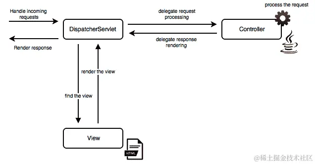 这个Servlet负责将请求委托给控制器,并在屏幕上呈现相应的页面,带有所需的数据。以下图表显示了DispatcherServlet如何处理请求: