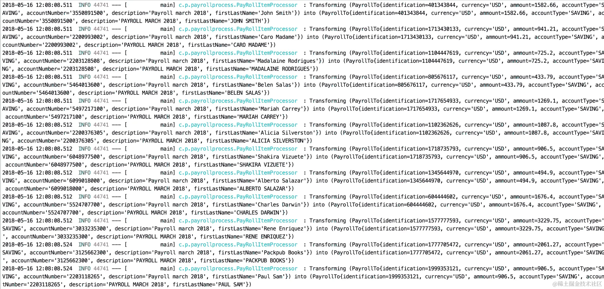 最后,我们将在控制台上看到以下输出。该输出代表已实现为 ItemProcessor 的过滤器,用于转换数据: