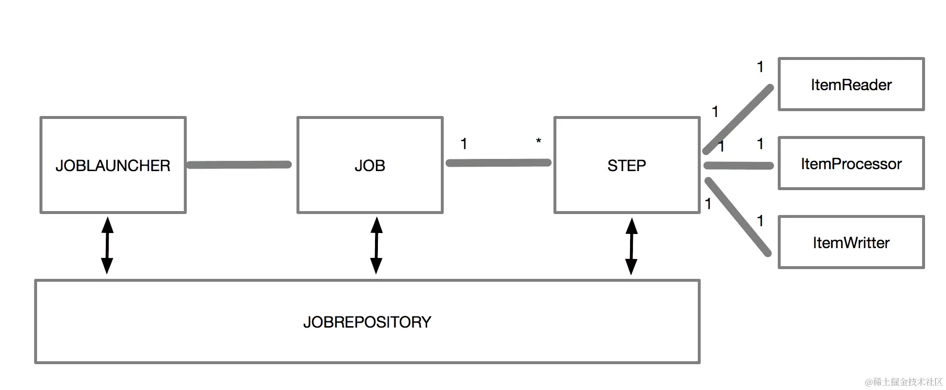 首先,它配置步骤以每次读取10 条记录的数据块,然后配置步骤与相应的reader、processor和writer对象。