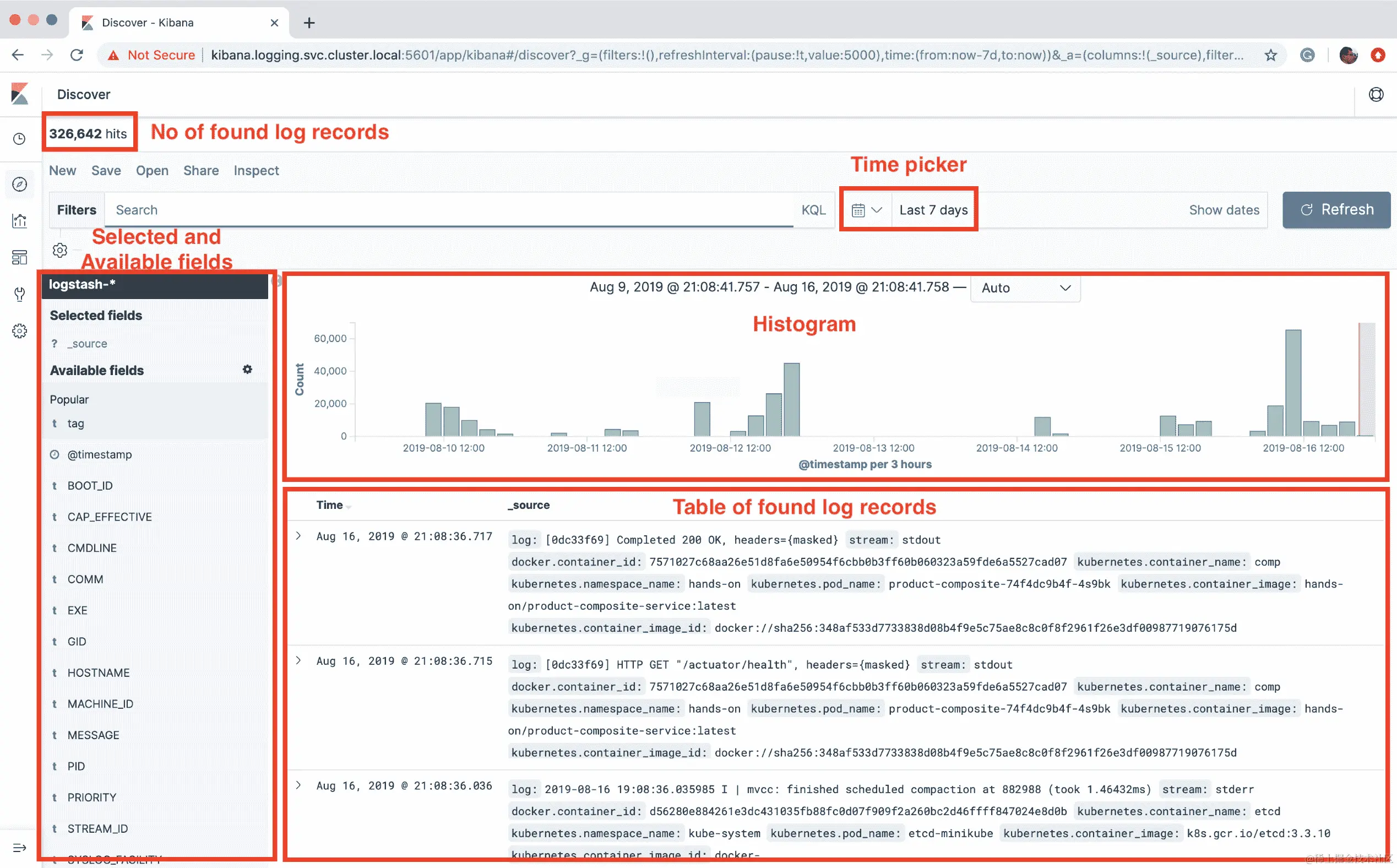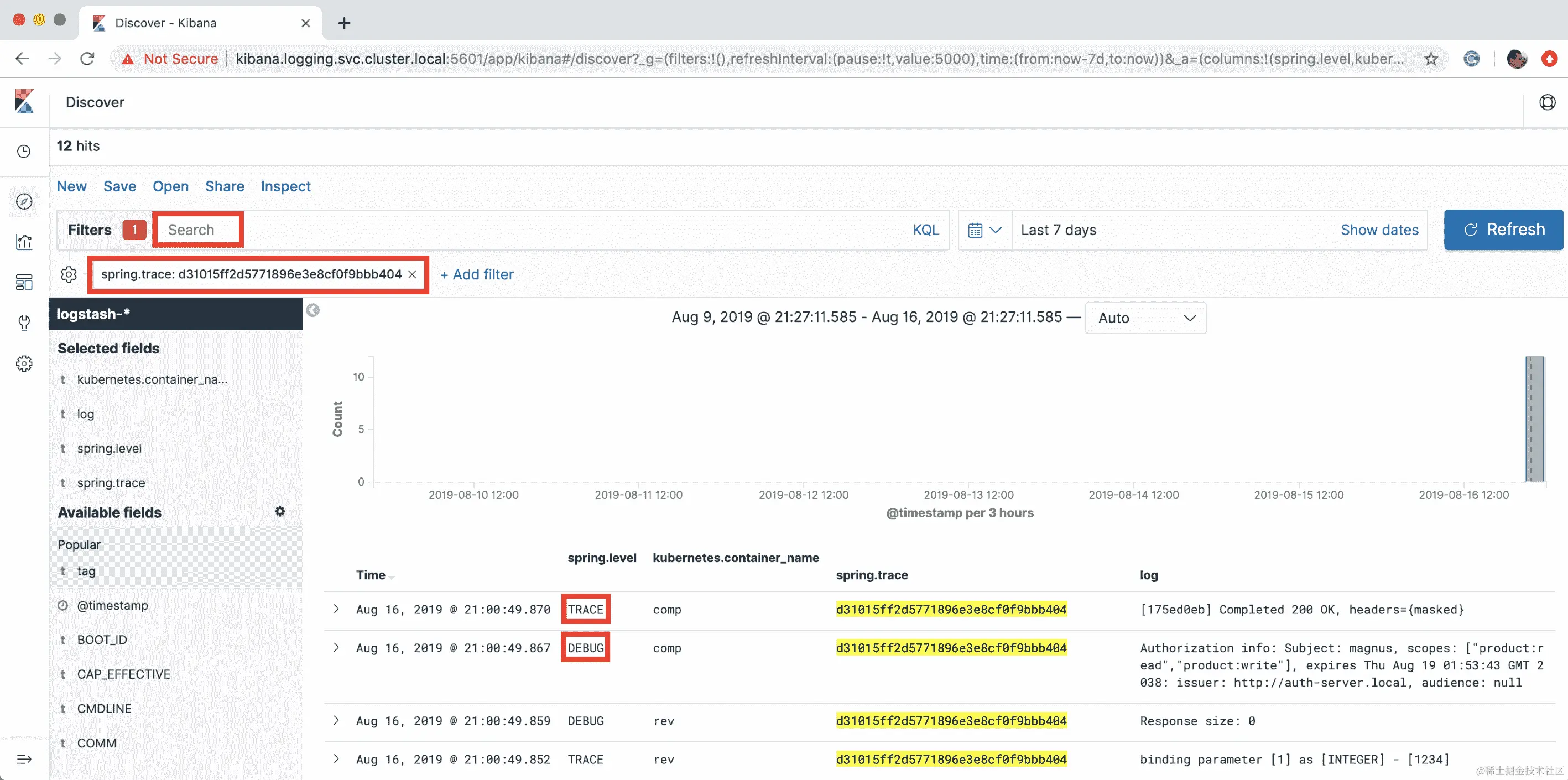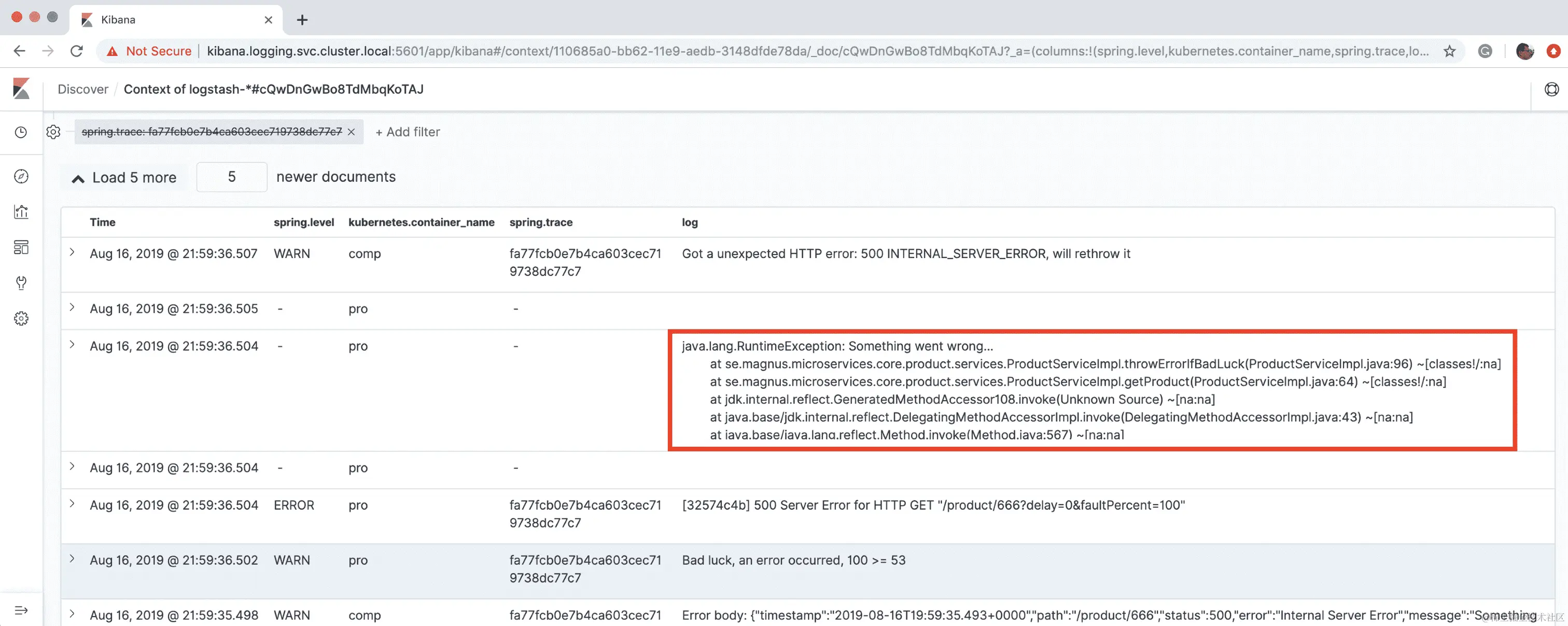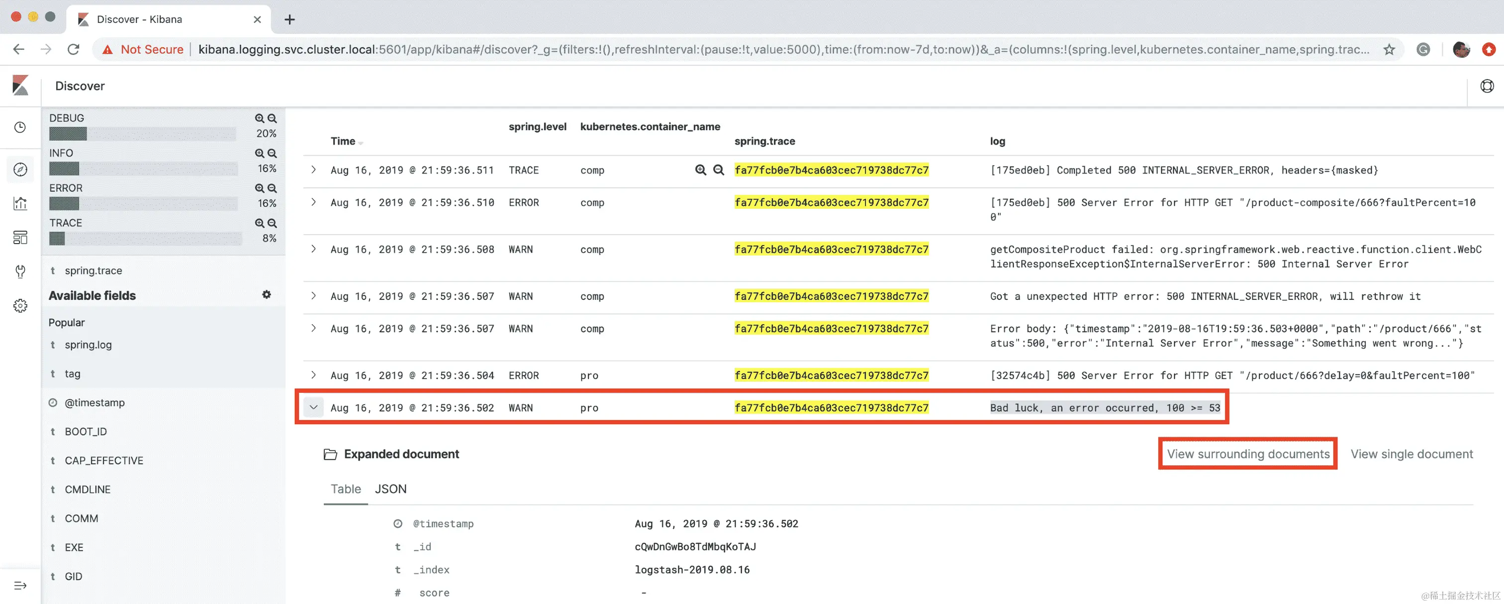 kubelet和 Docker 守护进程。源元素还将为 Kubernetes 中的日志记录打上完整的日志文件名,并用/替换.',并加上前缀kubernetes。由于标签基于完整的文件名,其中包含命名空间、Pod 和容器的名称等信息,因此标签对于通过匹配标签找到感兴趣的日志记录非常有用。例如,product-composite微服务的标签可能类似于kubernetes.var.log.containers.product-composite-7...s_hands-on_comp-e...b.log,而同一 Pod 中相应的istio-proxy的标签可能类似于kubernetes.var.log.containers.product-composite-7...s_hands-on_istio-proxy-1...3.log`。 -