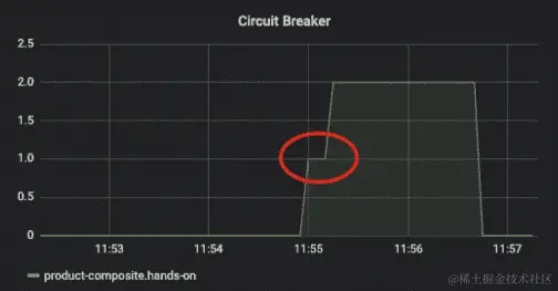 期望断路器指标的值上升到1,表示电路已打开。过了一会儿,它应该上升到2,表示电路现在是半开状态。这证明了我们可以在出现问题时监控断路器的打开。通过以下命令关闭电路断路器: