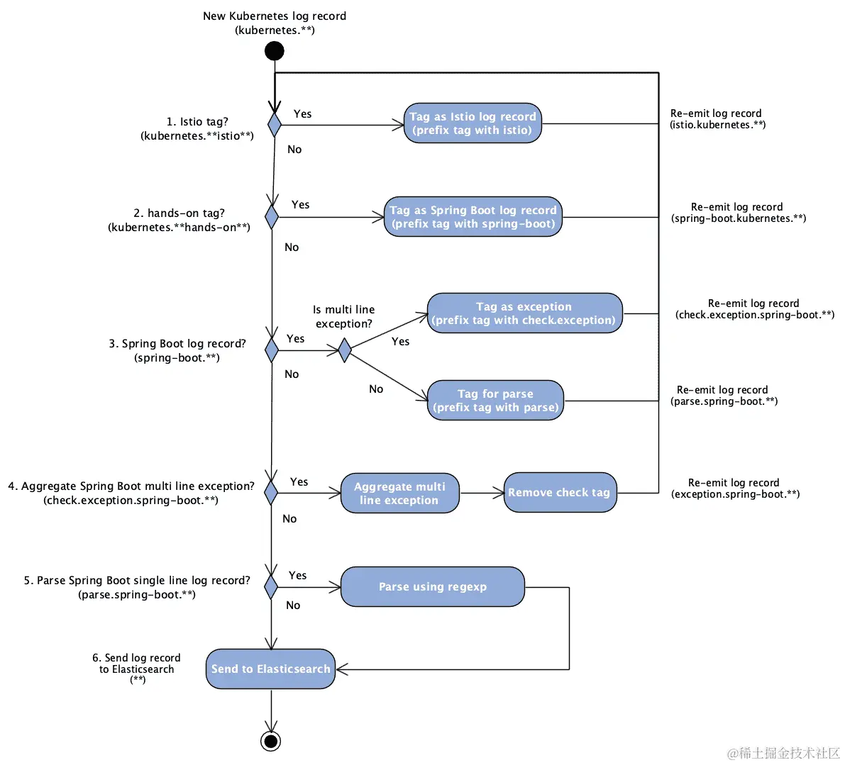 fluentd-hands-on.conf配置文件紧密遵循这个活动图。该配置文件放在一个 Kubernetes 配置映射中(参见kubernetes/efk/fluentd-hands-on-configmap.yml)。让我们一步一步地讲解,如下所述: