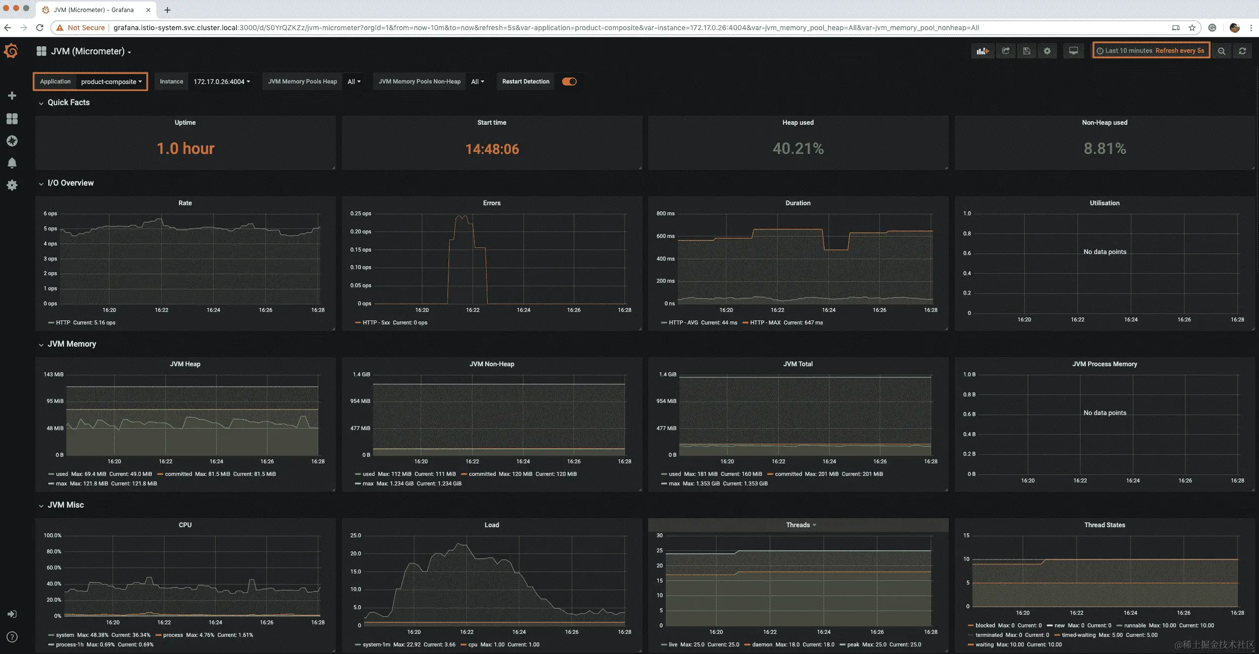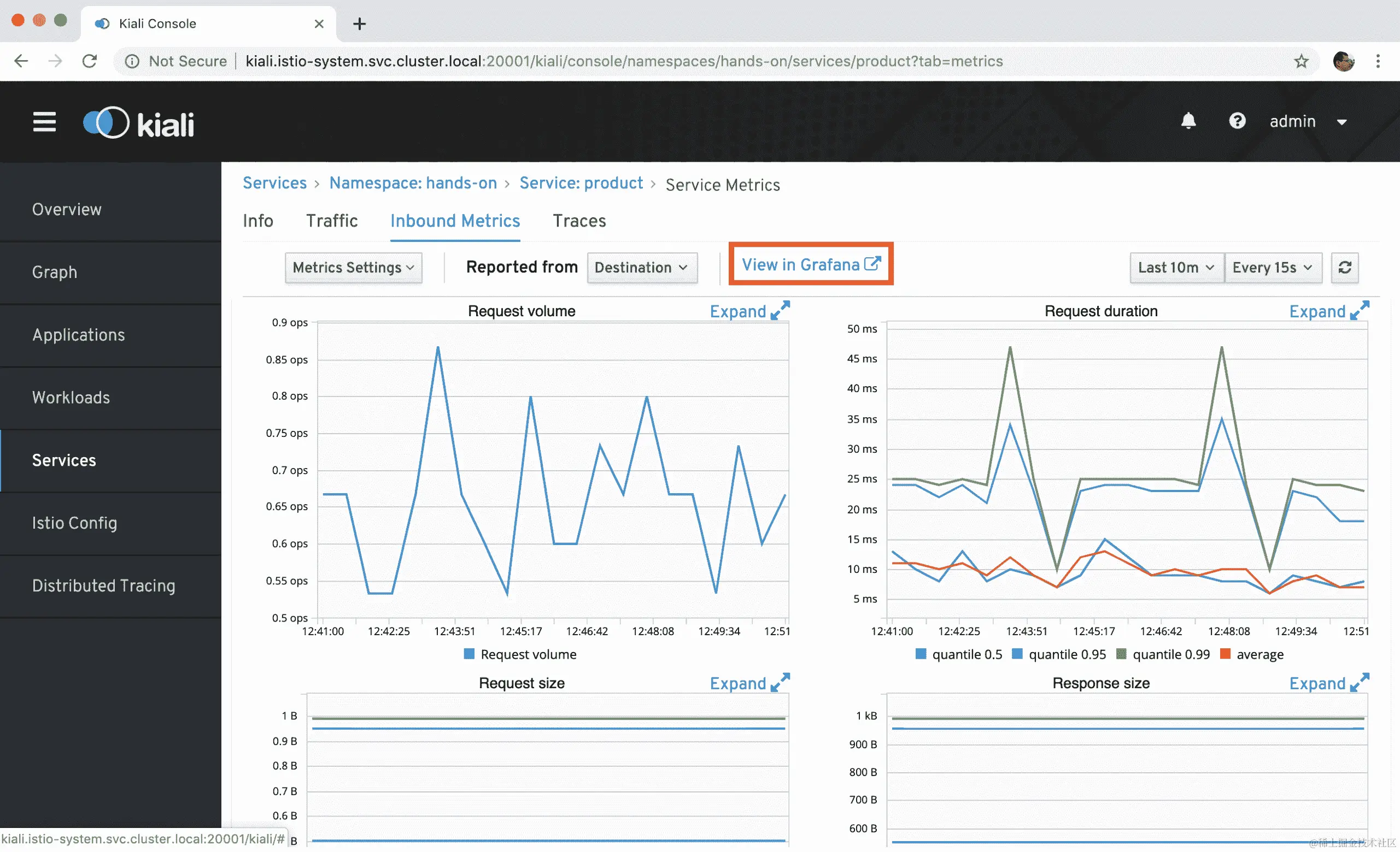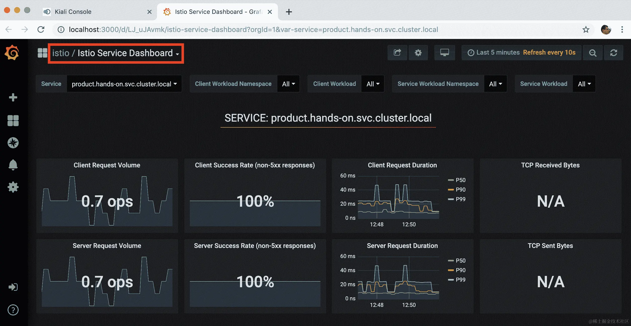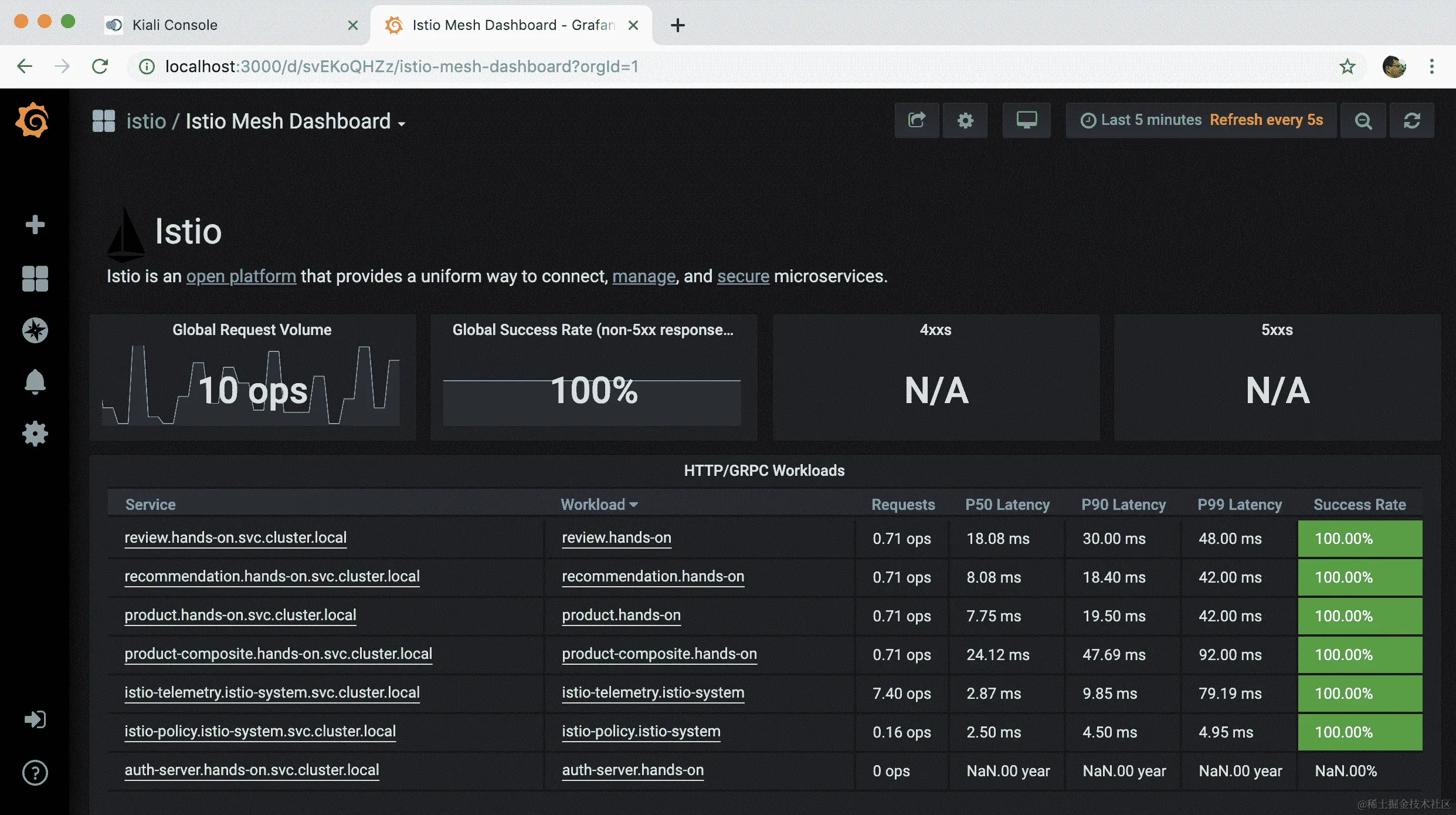 然后,我们了解了如何使用 Grafana 仪表板来监控收集的指标。既有 Kiali 自带的仪表板,也有 Grafana 社区分享的仪表板。我们还学习了如何开发我们自己的仪表板,其中我们使用了来自 Resilience4j 的指标来监控其断路器和重试机制的使用。