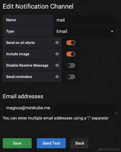 要在 Grafana 中配置基于邮件的通知渠道,请执行以下步骤: