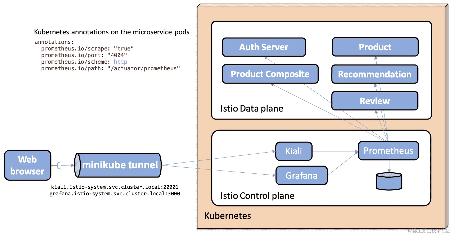 我们了解到,在 Kubernetes 环境中收集性能指标时,可以使用 Prometheus。接着,我们学习了当在 pods 定义中添加几个 Prometheus 注解时,Prometheus 如何能够自动从 pods 收集指标。为了在我们的微服务中产生指标,我们使用了 Micrometer。