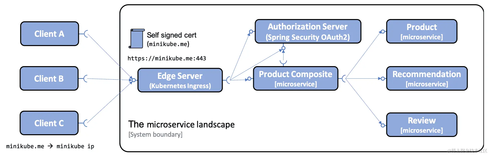 如第十五章、Kubernetes 简介中介绍的,Kubernetes 中的 ingress 资源可以像 Spring Cloud Gateway 一样作为边缘服务器使用。Spring Cloud Gateway 带有比 ingress 资源更丰富的路由功能。但是 ingress 特性是 Kubernetes 平台的一部分,也可以使用 Cert Manager 自动提供证书,如我们在本章后面所看到的。