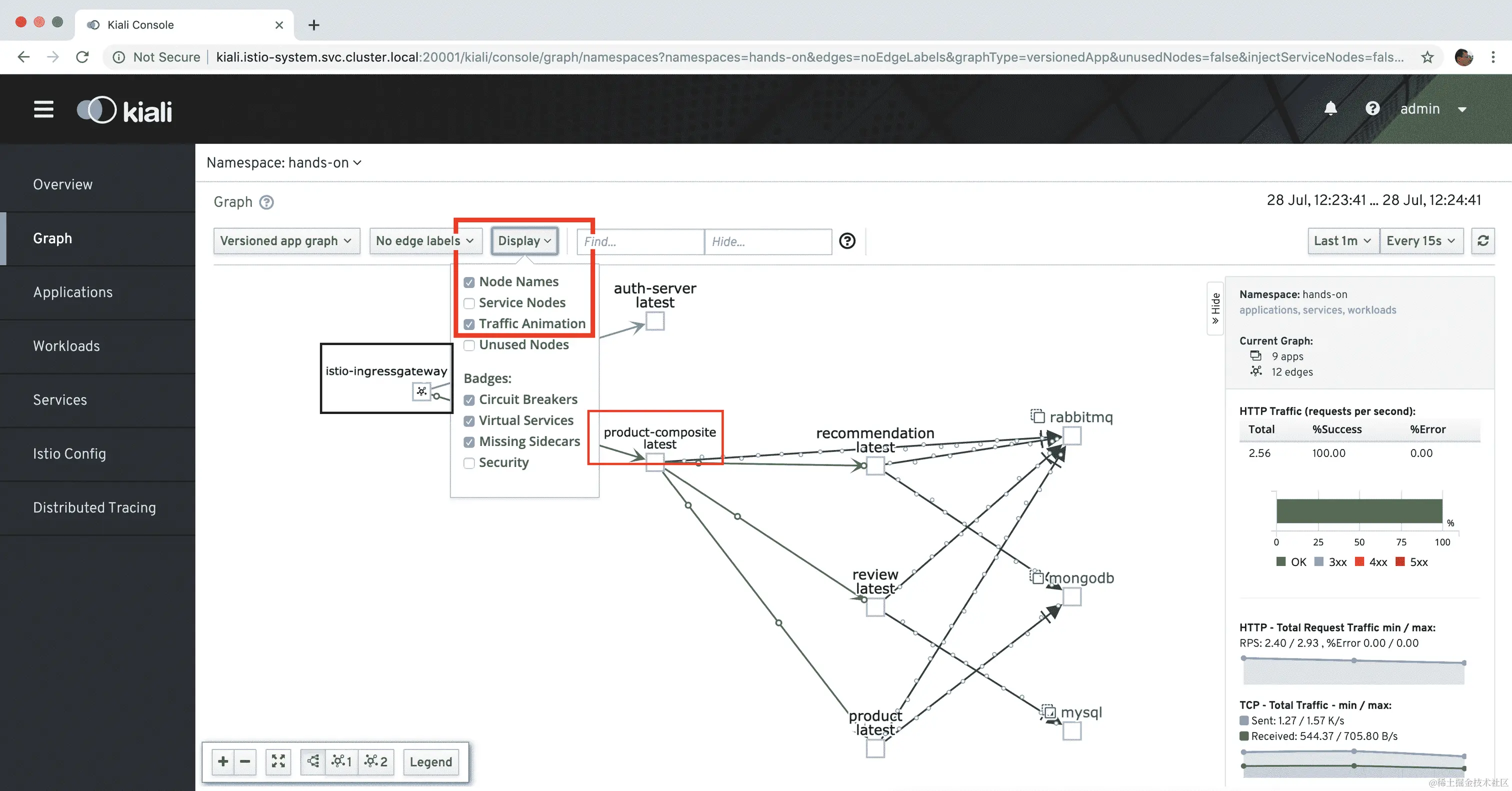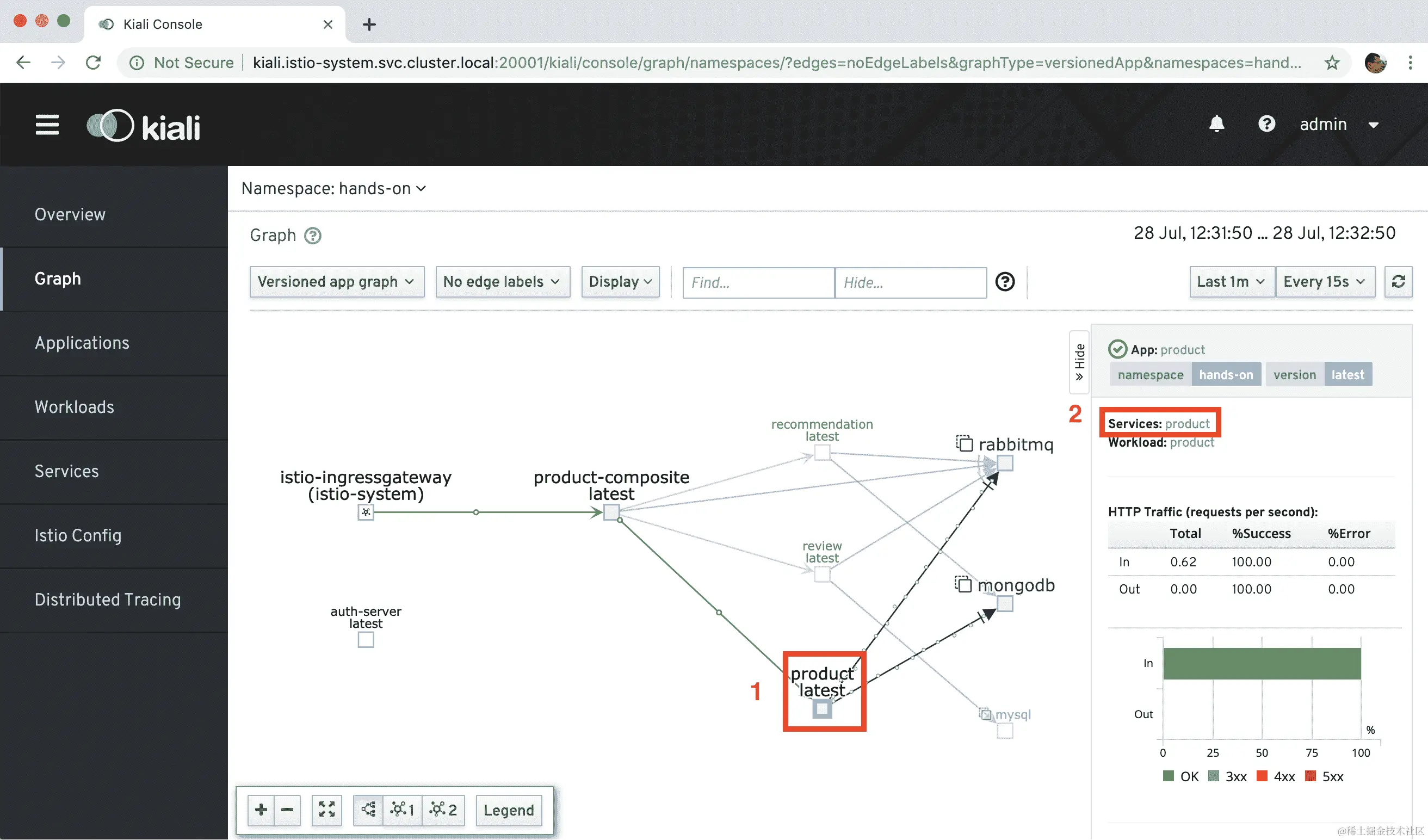 kiali.istio-system.svc.cluster.local:20001/kiali)并选择图表视图。 -