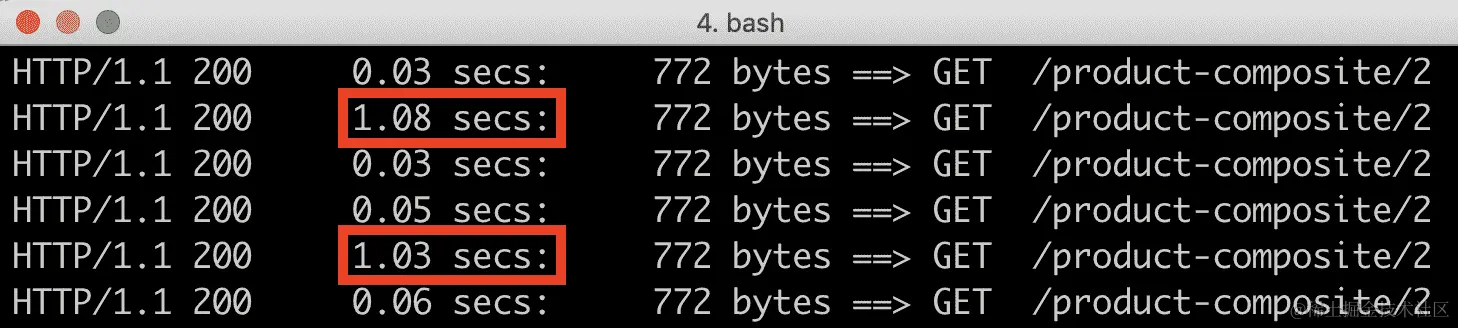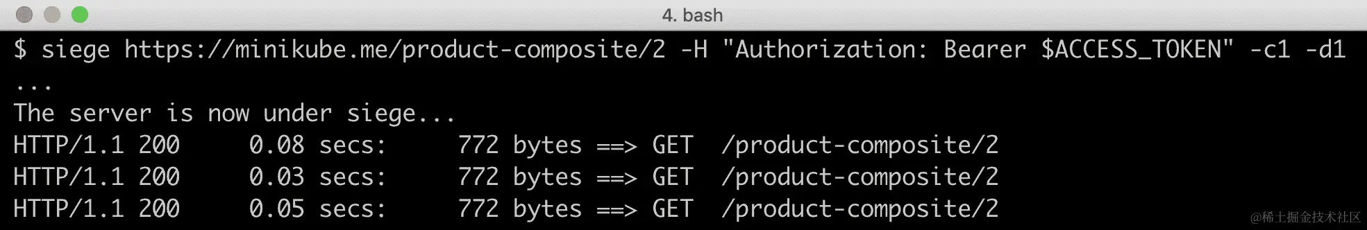 Siege仍在运行。它是在前面的验证所有流量最初都发送到微服务的 v1 版本部分启动的。