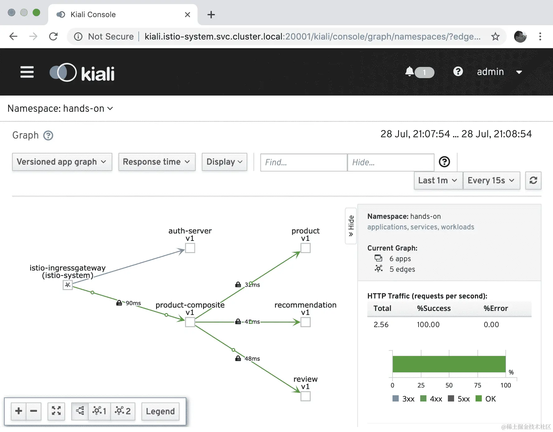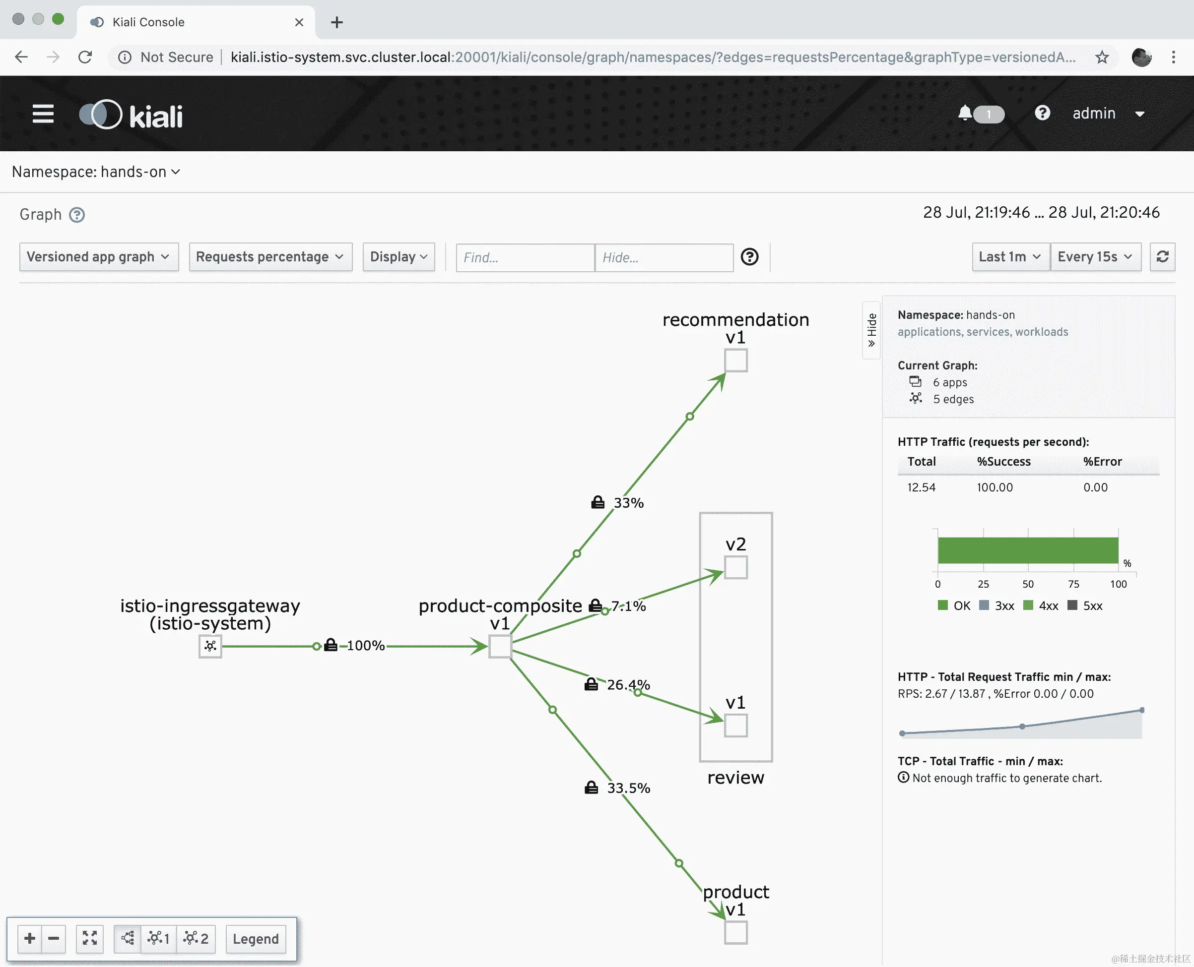 你必须给 Kiali 一分钟左右的时间来收集指标,然后它才能可视化微服务 v1 和 v2 版本之间的路由变化,但请记住,实际路由的变化是即时的!