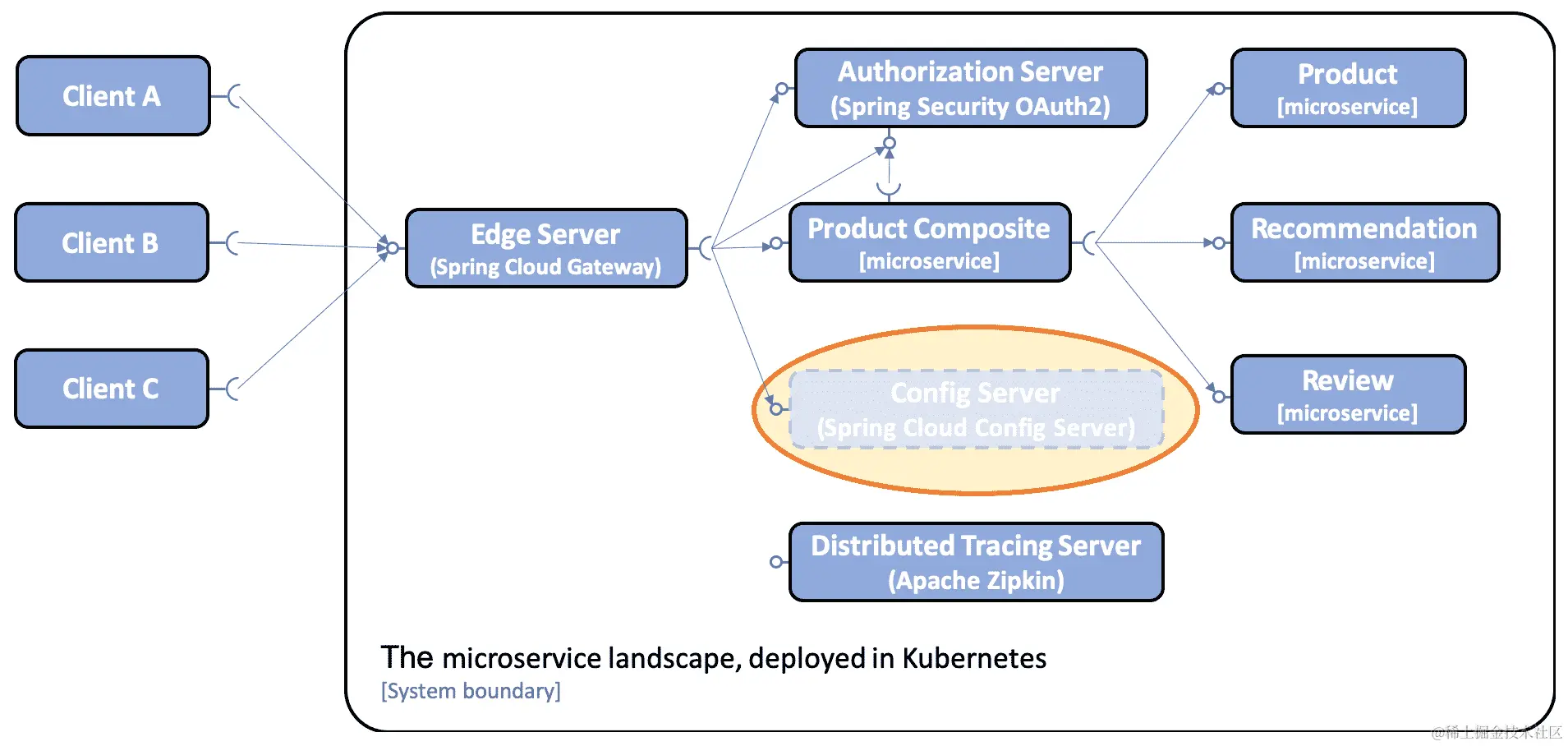 使用 Kubernetes 的配置映射和秘钥,而不是 Spring Cloud Config Server,可以加快微服务架构的启动速度,并减少所需内存。它还将通过消除一个支持服务,即配置服务器,简化微服务架构。如下图所示: