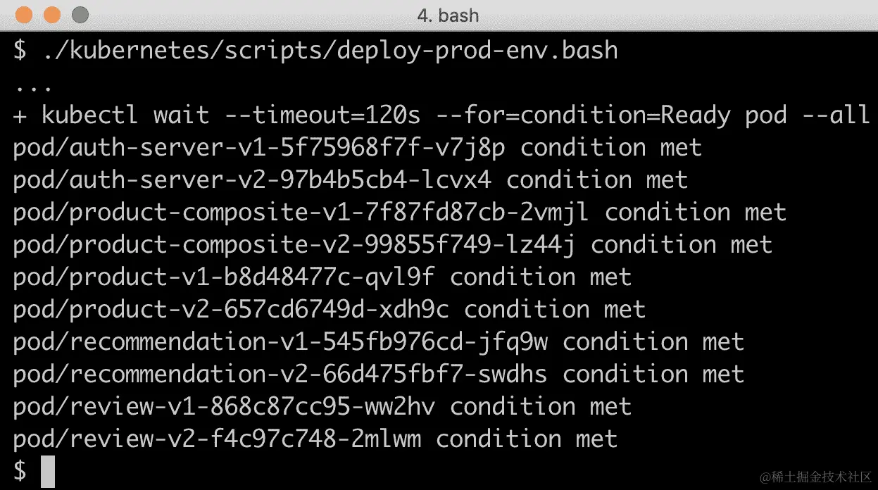 要查看响应了请求的微服务的哪个版本,可以检查响应中的serviceAddresses字段。serviceAddresses字段包含每个参与创建响应的服务的主机名。主机名等于 pods 的名称,因此我们可以通过主机名找到版本;例如,对于版本 V1 的产品服务,主机名为product-v1-...,对于版本 V2 的产品服务,主机名为product-v2-...。