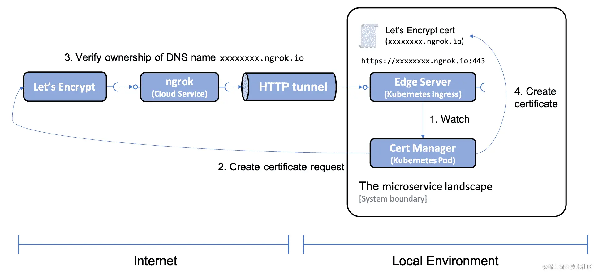 在第十一章中,关于保护 API 访问安全,参考使用 HTTPS 保护外部通信小节,我们使用证书来保护外部 API。手动处理证书既耗时又容易出错。作为替代方案,我们将介绍 Cert Manager,它可以自动为入口暴露的外部 HTTPS 端点提供新证书并替换已过期的证书。我们将配置cert-manager使用Let's Encrypt发行证书。Let's Encrypt 是一个可以用来自动颁发证书的免费证书授权机构。Let's Encrypt 必须能够验证我们拥有将发行证书的 DNS 名称。由于我们的 Kubernetes 集群在 Minikube 中本地运行,我们必须让 Let's Encrypt 在配置过程中能够访问我们的集群。我们将使用ngrok创建一个从互联网到我们本地 Kubernetes 集群的临时 HTTP 隧道,供 Let's Encrypt 使用。