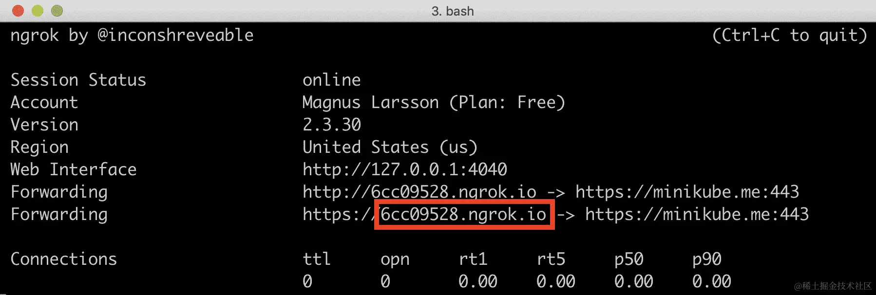 在这里,<YOUR_AUTH_TOKEN>用以下页面找到的授权令牌替换——dashboard.ngrok.com/auth。