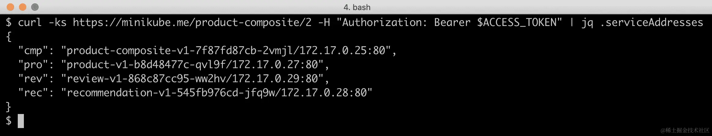 curl -ks https://minikube.me/product-composite/2 -H "Authorization: Bearer $ACCESS_TOKEN" | jq .serviceAddresses