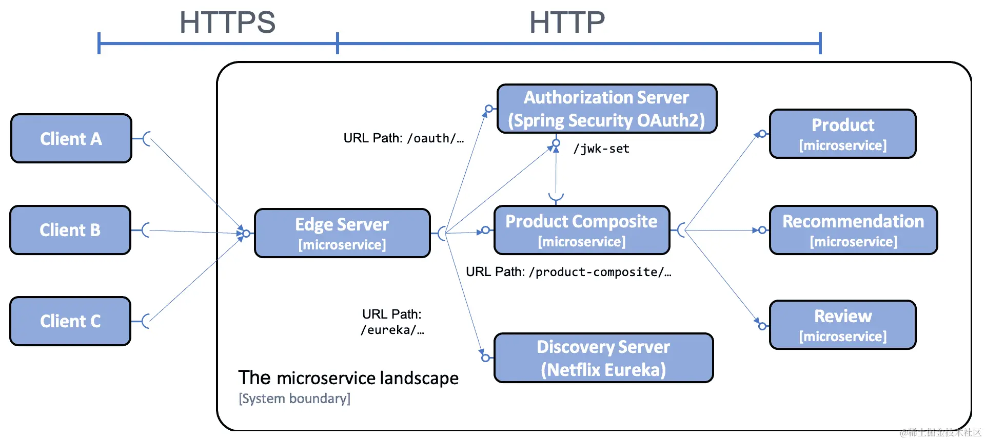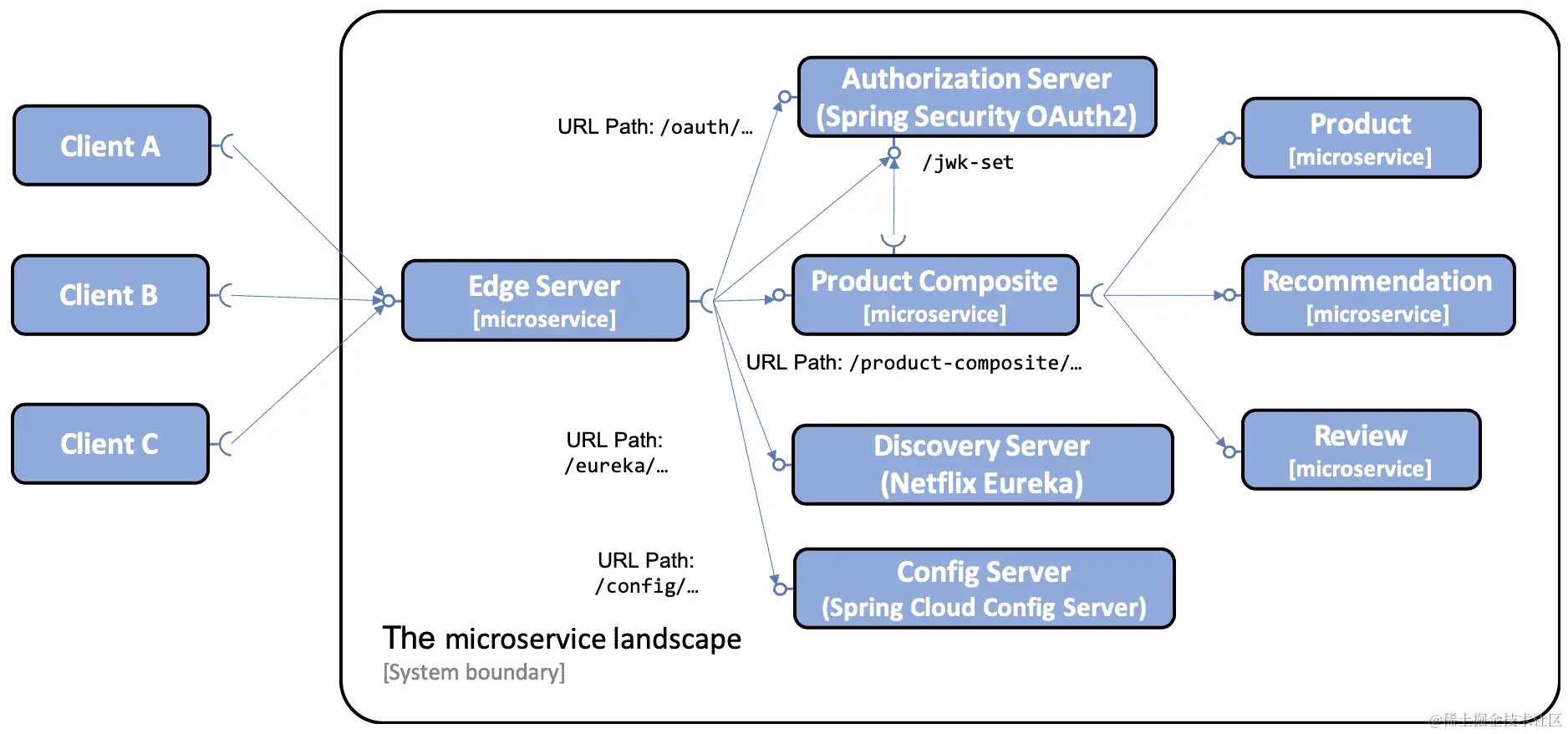 从前面 diagram 可以看出,外部客户端将其所有请求发送到边缘服务器。边缘服务器可以根据 URL 路径来路由传入的请求。例如,以/product-composite/开头的 URL 的请求会被路由到产品组合微服务,以/eureka/开头的 URL 的请求会基于 Netflix Eureka 被路由到发现服务器。