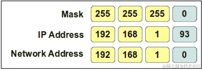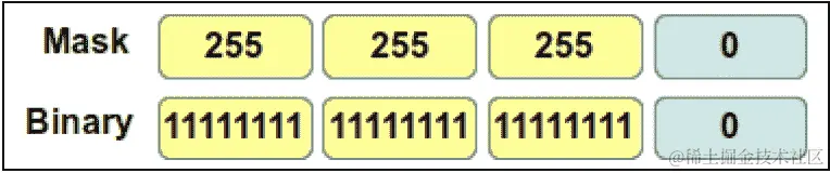 我们可以看到我们的掩码的前三个八位字节是255。这意味着我们的IP 地址的前三个八位字节属于网络地址。在我们的计算中,这意味着剩下的八位字节是0: