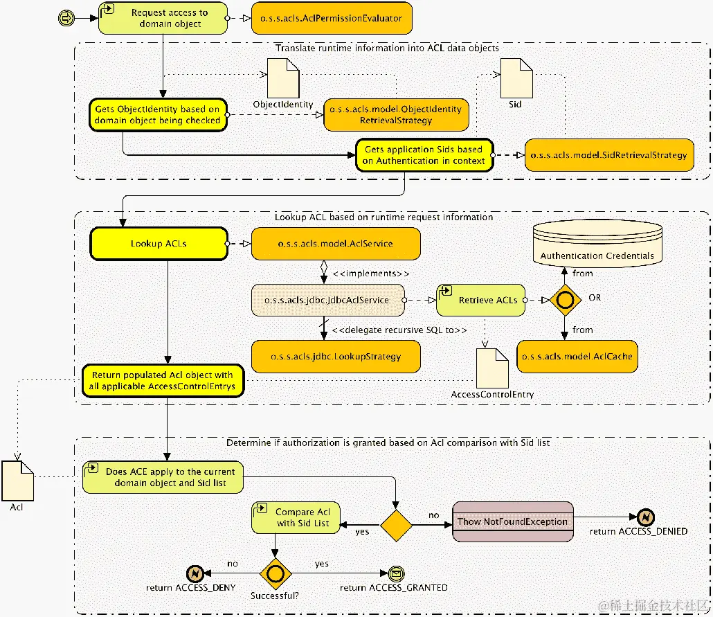 以下高级流程图展示了在方法调用授权决策中涉及的主要参与者: