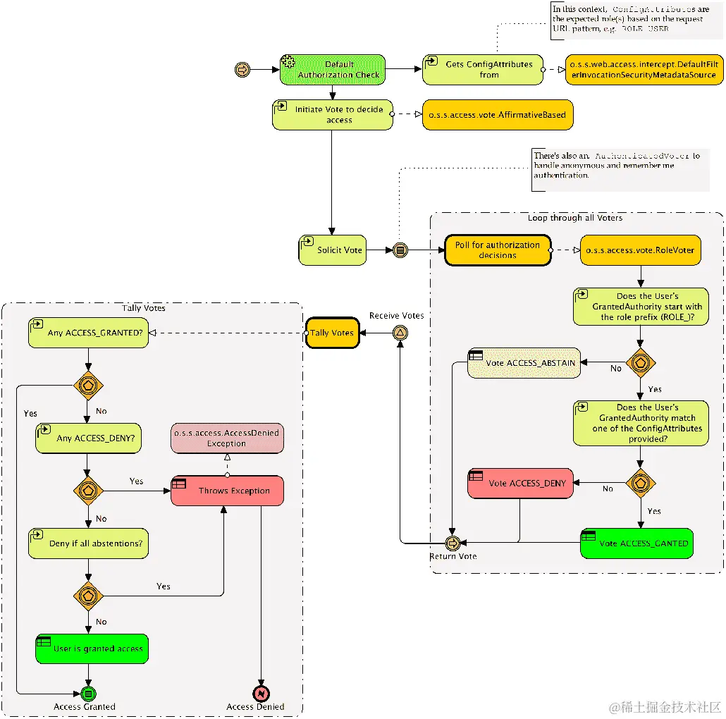 方法安全性的访问决策机制-是否允许给定请求-与 web 请求访问的访问决策逻辑概念上是相同的。AccessDecisionManager轮询一组AccessDecisionVoters,每个都可以提供允许或拒绝访问的决定,或者弃权。AccessDecisionManager的具体实现聚合了投票者的决定,并得出一个总体的决定来允许方法调用。