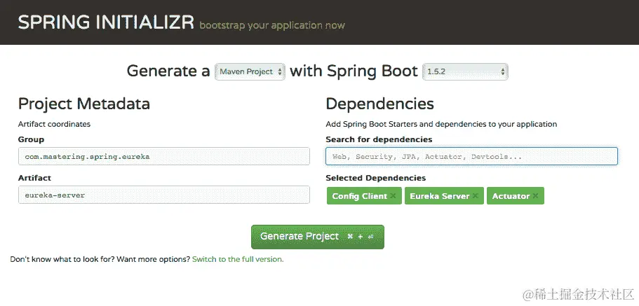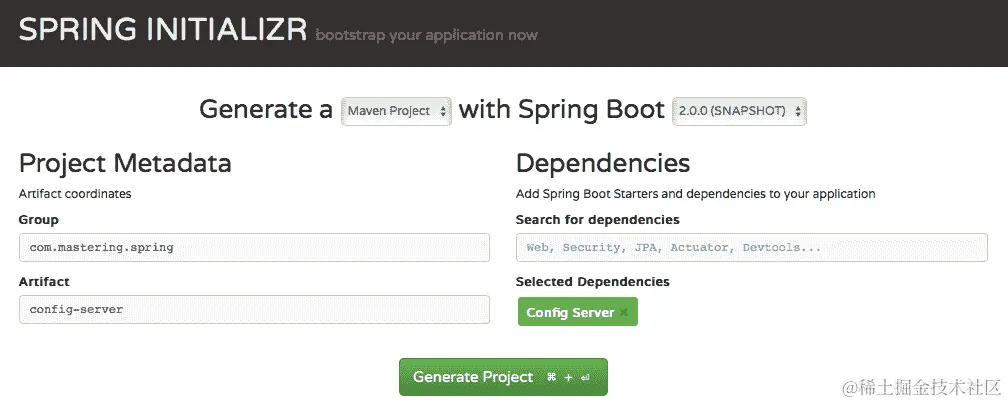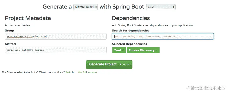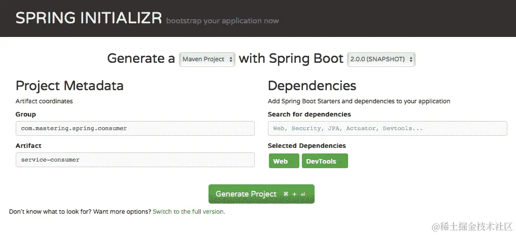 我们将使用 Spring Initializr (start.spring.io)来设置一个新项目。以下截图显示了要选择的 GroupId、ArtifactId 和 Dependencies: