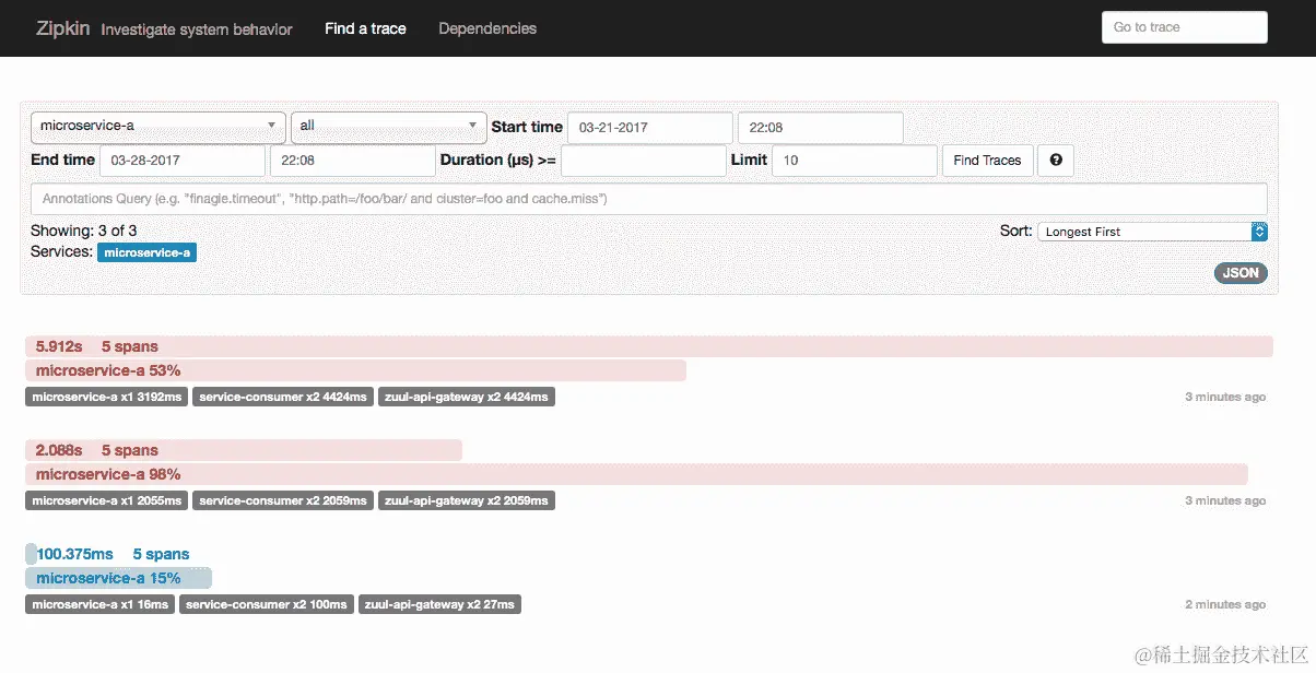Zipkin UI:提供带有搜索功能的仪表板。