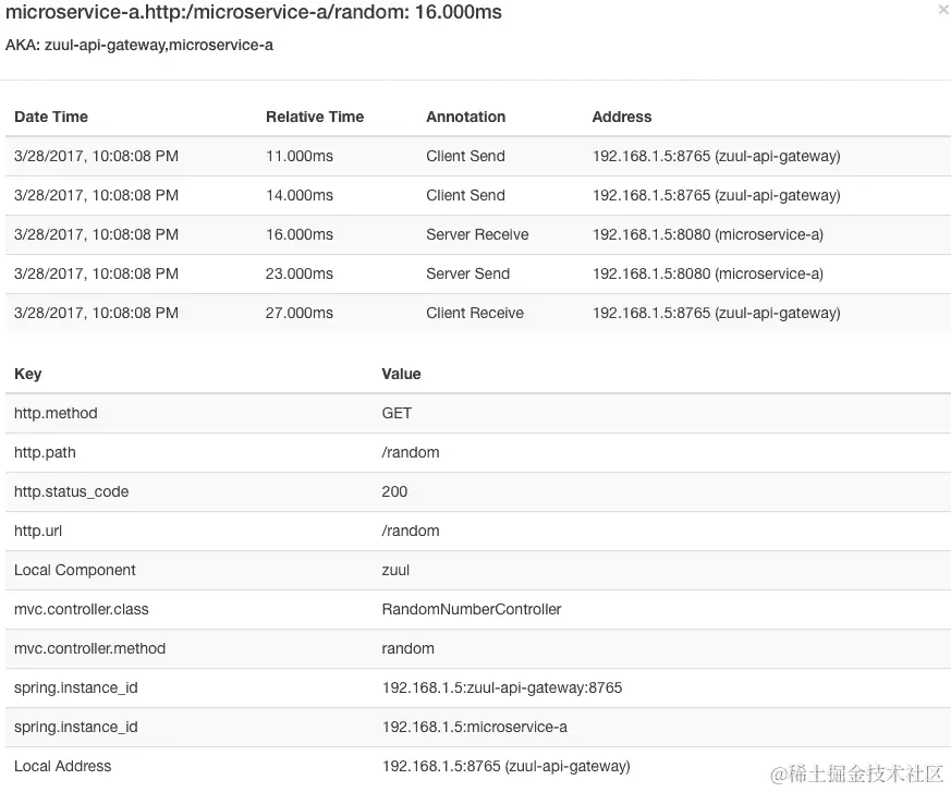 继续执行http://localhost:8100/add上的add服务。现在您可以在 Zipkin 仪表板上看到详细信息。以下截图显示了一些详细信息: