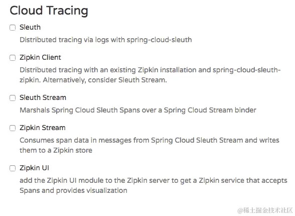 以下截图显示了 Spring Initializr 网站上分布式跟踪的选项:
