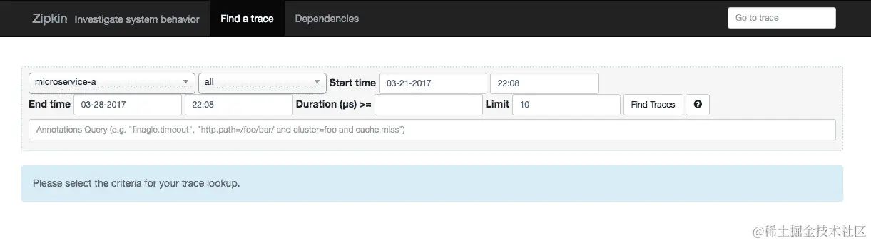 您可以在http://localhost:9411/上启动 Zipkin UI 仪表板。以下是该仪表板的截图。由于没有任何微服务连接到 Zipkin,因此没有显示任何数据: