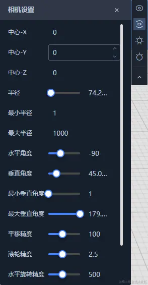 相机设置中提供了旋转相机相关的属性设置,例如旋转相机的中心、最大最小半径的限制、旋转角度的限制等。我们会在相机及视角章节中为您详细介绍相机属性的功能。