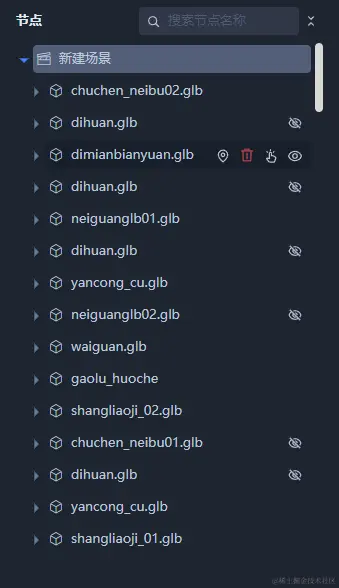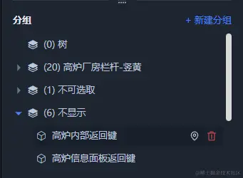 鼠标悬停在节点上时,右侧会出现一些操作图标。点击删除图标时,若是分组节点则会删除该分组,同时会将该分组从节点分组信息中移除,若是模型节点则会从该分组中移除该节点,不会删除该节点。点击定位按钮时会将相机定位至该节点。