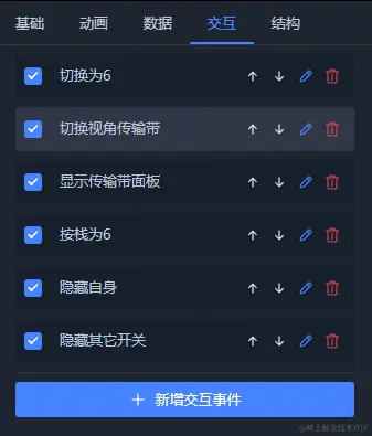 用户可以对操作对象设置任意数量的交互事件,每个满足条件的事件会按照列表顺序由上至下依次执行,您可以在编辑状态下随时点击上移或者下移图标调整事件顺序。当关闭事件名称前的勾选框时,则表示该事件在运行状态下永远不会被执行。