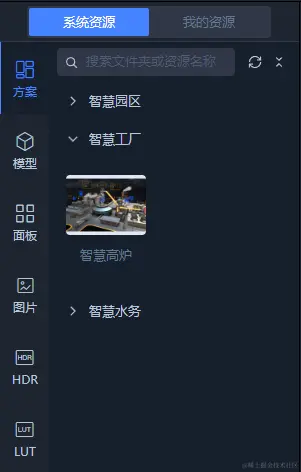 3D场景中可以用到的资源包括模型、图片、环境光照贴图(HDR)、颜色查找(LUT)等,除了系统预设的资源外,用户也可以上传并使用自己的资源文件。您可以在顶部切换显示系统资源或者我的资源,使用搜索栏可显示含有指定名称的资源,刷新按钮可重新加载所有资源,收起按钮可快速折叠文件夹。