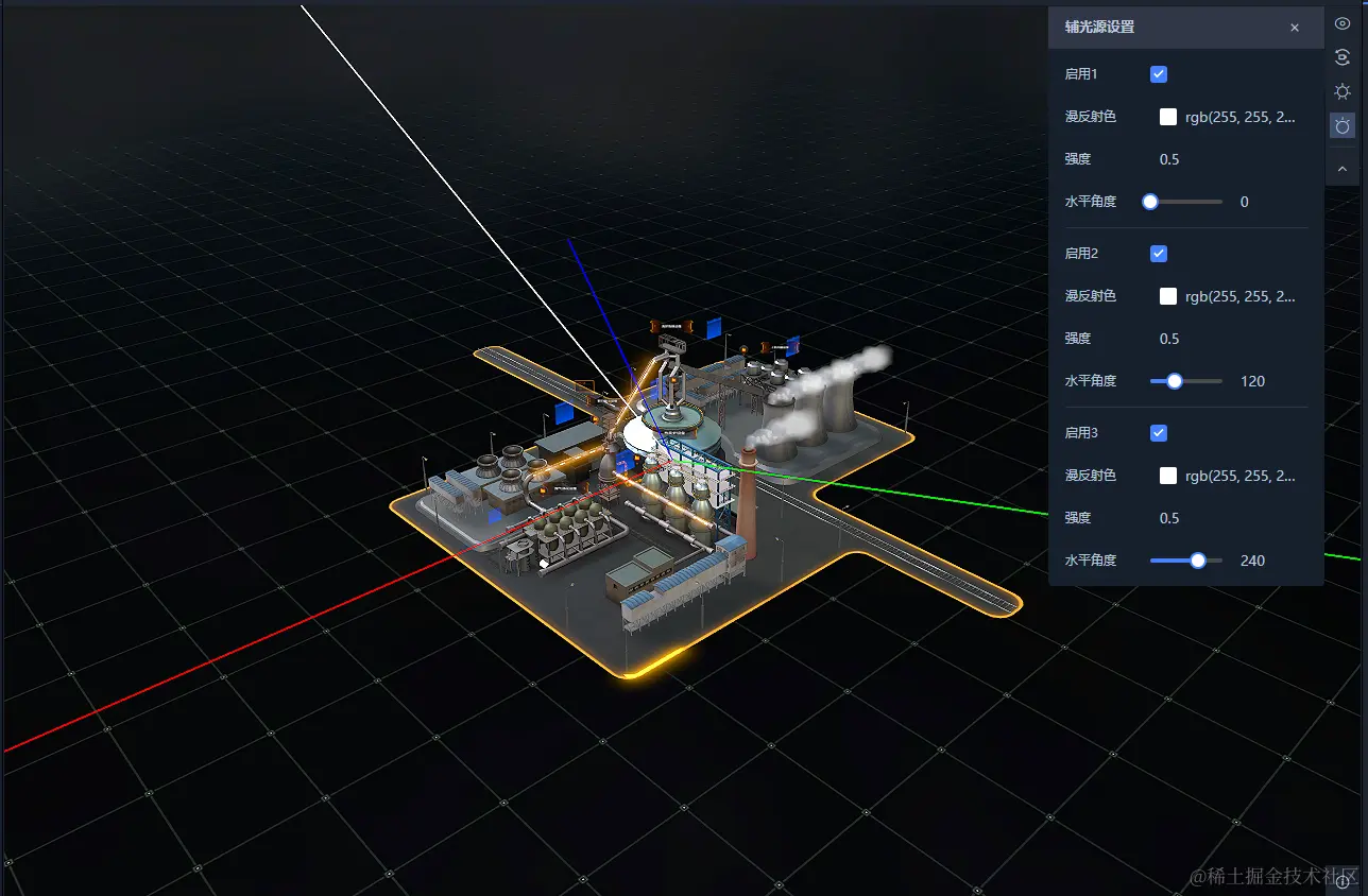 - 右侧属性栏,包含场景及模型的基础属性、动画、动态数据、交互事件以及场景模型结构,还有相机和光源的配置按钮。