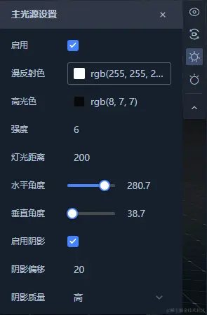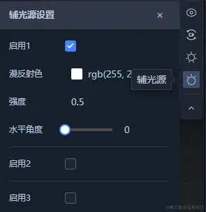 在属性面板左侧有一些小按钮,分别是相机视角、相机、主光源、辅光源。