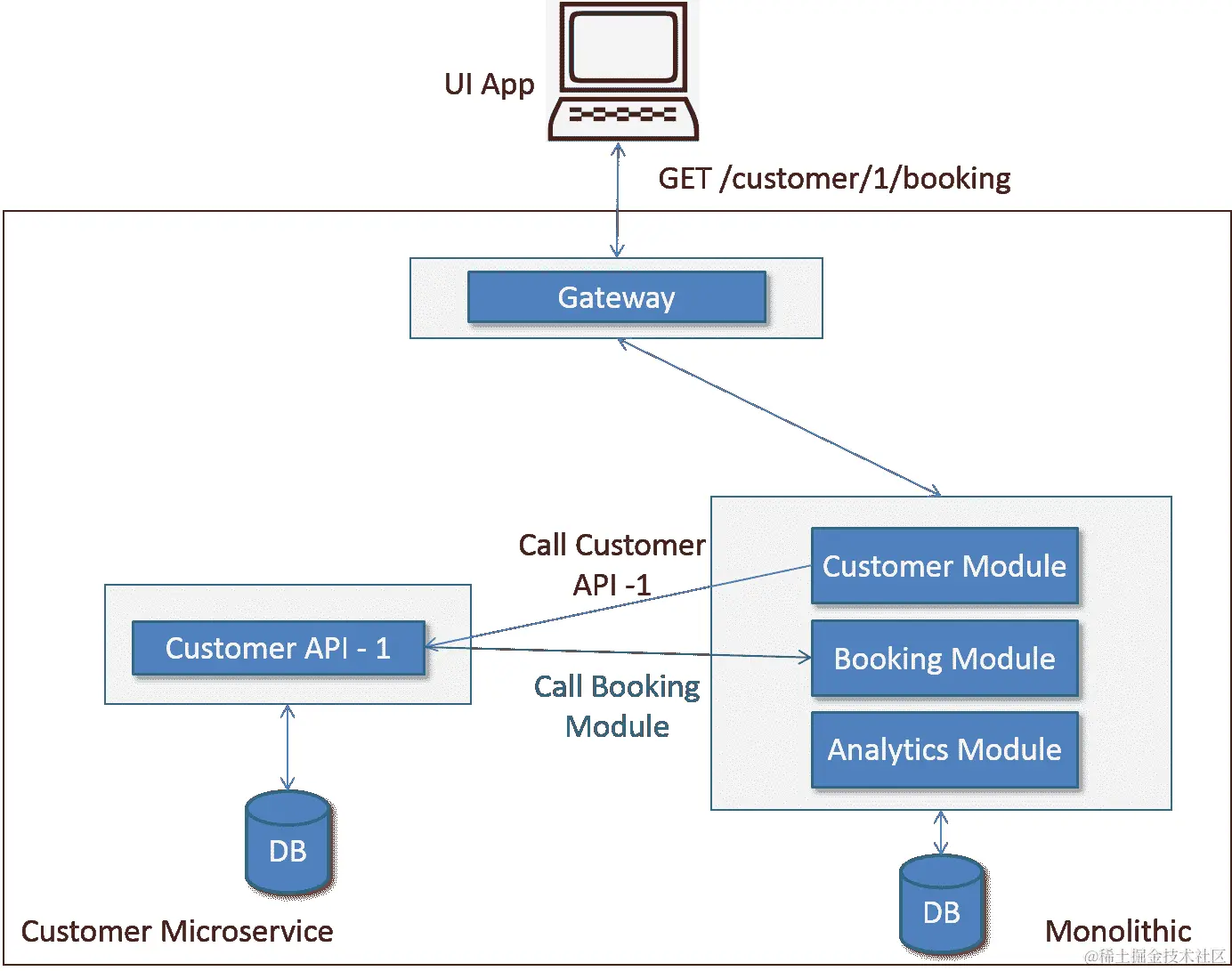 现在,你有一个服务器端的单体应用程序和一个或多个 UI 应用程序。这为你提供了另一个优势,即在分离模块的同时消费 API,从而分离现有的单体应用程序。例如,在分离 UI 应用程序后,你可能将其中一个模块转换为微服务。一旦 UI 应用程序成功测试,与该模块相关的 API 调用可以路由到新转换的模块,而不是现有的单体 API。如图所示,当调用 API GET/customer/1 时,网络网关可以将请求路由到客户微服务,而不是单体应用程序。