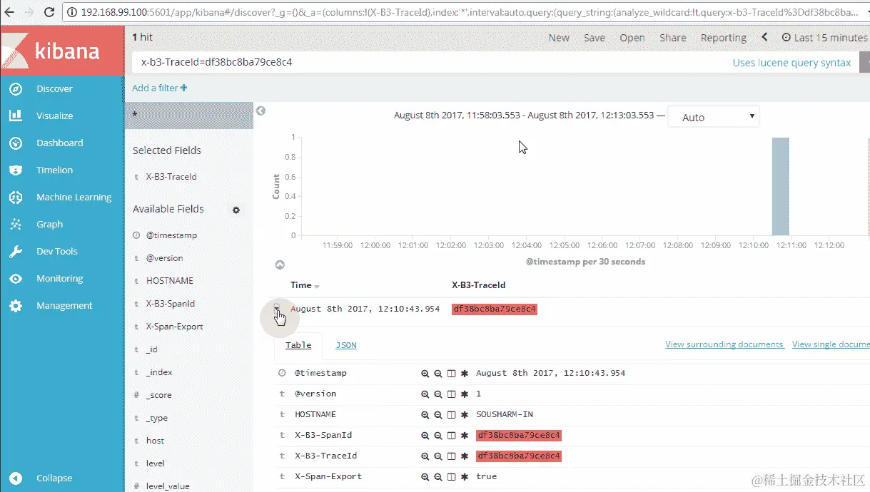 现在,如果 ELK 栈已经配置并运行,那么你可以使用这个跟踪 ID 在 Kibana 中找到相应的日志,如下面的屏幕截图所示。Kibana 中有一个 X-B3-TraceId 字段,用于根据跟踪 ID 过滤日志: