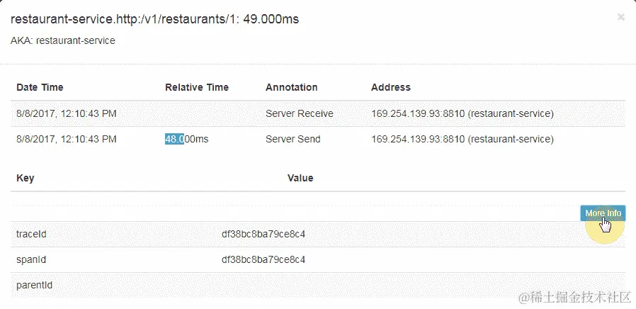 在下面的截图中,你可以看到餐厅findById API 调用所花费的时间以及同一请求的跟踪 ID。它还显示了跨度 ID: