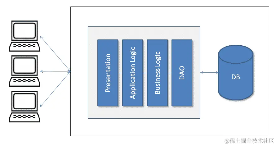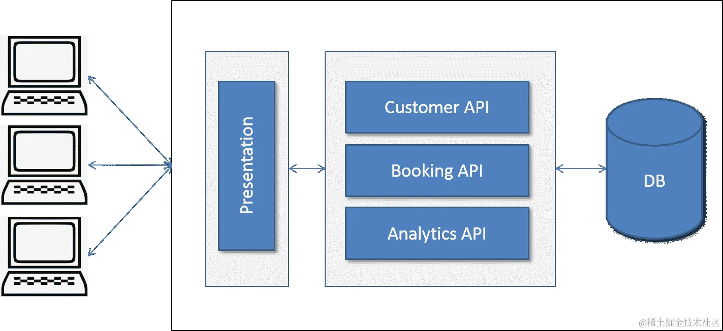 您可以看到,以前,UI 被包含在单体应用程序中,与业务逻辑和 DAO 一起。迁移后,UI 应用程序从单体应用程序中分离出来,并使用 API 与服务器代码通信。REST 是实现 API 的标准,可以在现有代码之上编写。