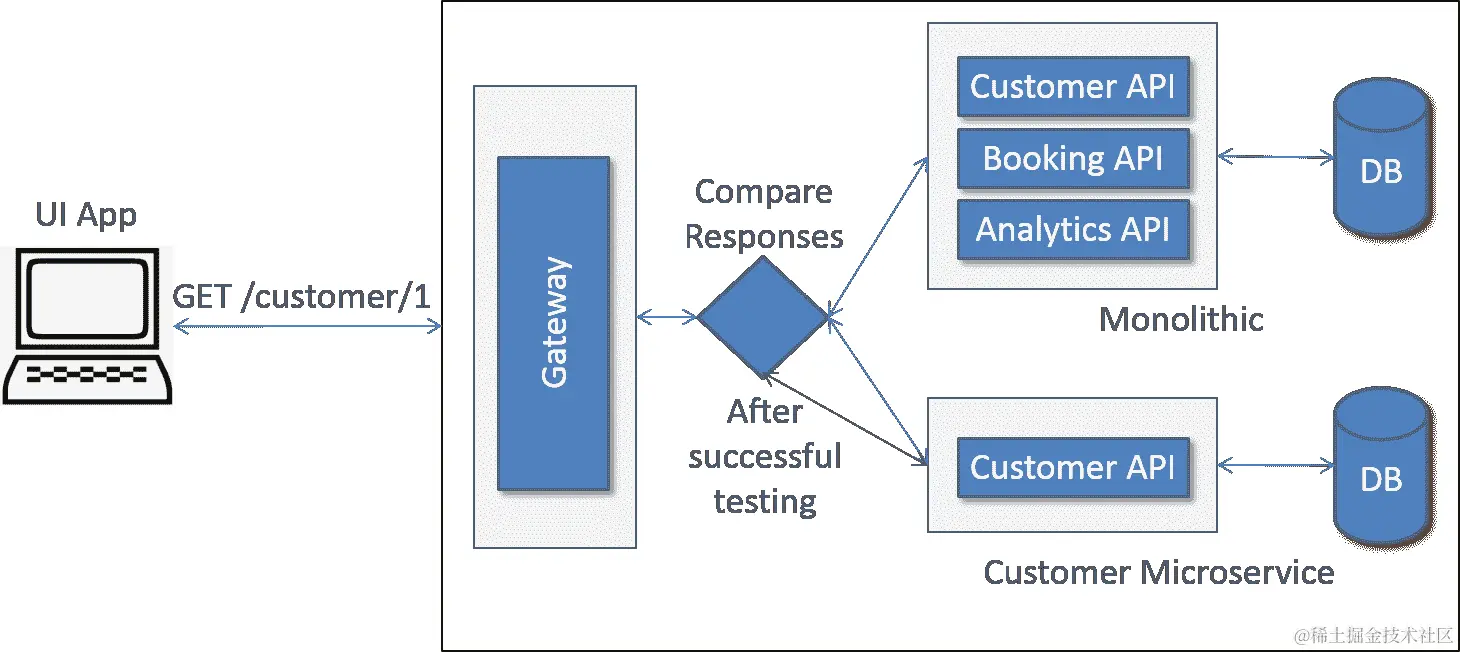 你还可以通过比较单体和微服务模块的响应,在将基于微服务的 API 上线之前,在生产环境中进行测试。一旦我们得到一致的匹配响应,我们可以确信转换已经成功完成,并且 API 调用可以迁移到重构模块的 API。如图所示,当调用客户 API 时,部署了一个组件,该组件会调用一个新的客户微服务。然后,它比较了两次调用的响应并存储结果。这些结果可以进行分析,并对任何不一致性进行修复。当新转换的微服务的响应与现有的单体响应相匹配时,你可以停止将调用路由到现有的单体应用程序,并用新的微服务替换它。