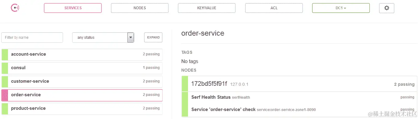 每个微服务在两个不同的区域都有两个运行实例。在用mvn clean install命令构建整个项目后,你应该使用zone1或zone2活动配置启动 Spring Boot 应用程序,例如,java -jar --spring.profiles.active=zone1 target/order-service-1.0-SNAPSHOT.jar。您可以在节点部分查看带有区域标签的注册实例的完整列表。Consul 仪表板的观点在以下屏幕快照中可见:
