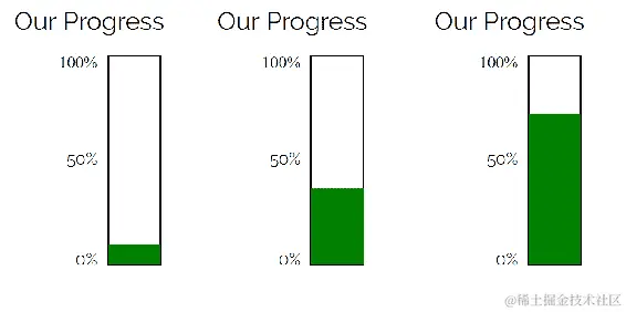第一个the-bar定义了条形图的轮廓。第二个fill-the-bar定义了条形图的进度部分。它没有描边,填充为绿色。对我们来说有趣的部分是transition属性。transition是一组相关的transition-属性的简写。在这种情况下,我们使用了transition-property(transform)和transition-duration(3s)。这表示浏览器应该监视此元素上transform属性的更改,并在三秒内过渡到该属性的更改。在这个类中,我们还定义了一个scaleY transform,值为1,并使用transform-origin将transform锚定到元素的bottom。我们需要一个基准的scaleY,这样浏览器就有一个匹配的属性来进行动画。fill-the-bar:hover将比例改变为7.5,根据配置的方式,这将填满条形图的75%目标: