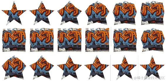 @keyframes遵循与之前动画相同的模式。我们有相同的起始和完成状态(0%和 100%)。这些被定义为一个多边形clip-path,用于说明一个星星。动画的中点(50%)将多边形重新定义为正方形。由于动画状态之间需要等效的点数,这意味着我们需要定义多于四个点来在这些状态之间进行动画: