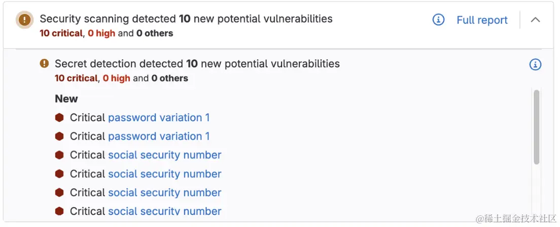合并请求包含一个安全小部件,它可以显示新检测到的漏洞的摘要。