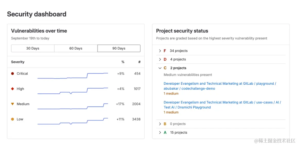 安全仪表板用于评估应用程序的安全状况。 极狐GitLab 为您提供了项目上运行的安全扫描器检测到的漏洞的一系列指标、评级和图表。安全仪表板提供以下数据: